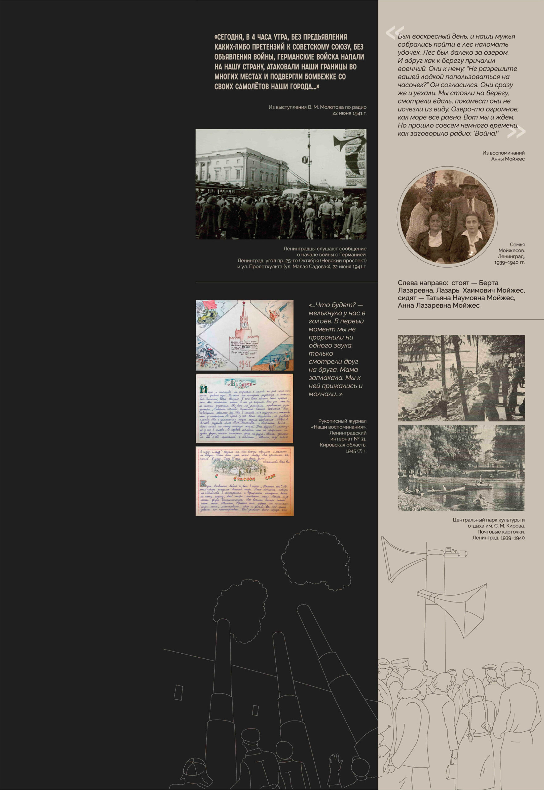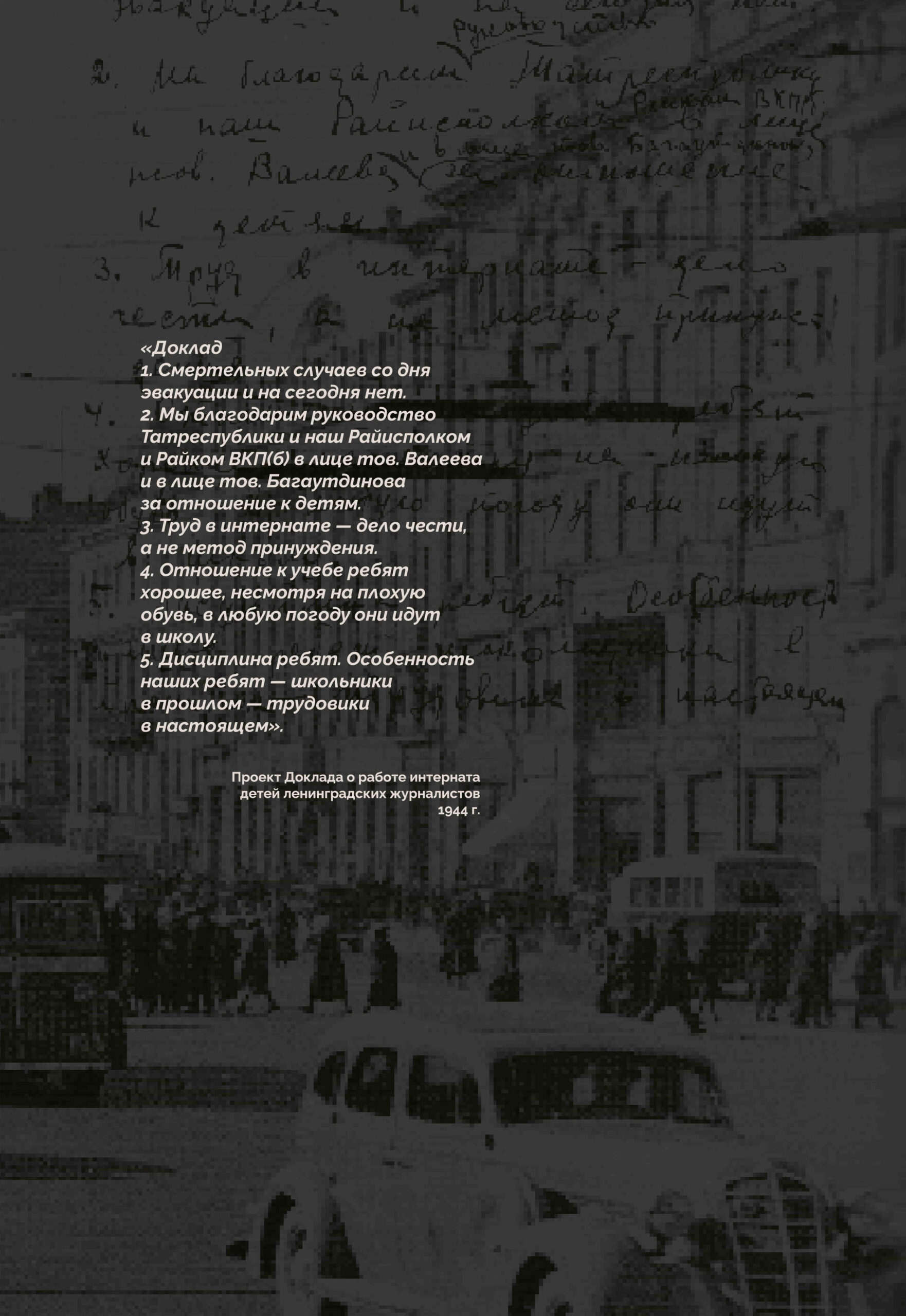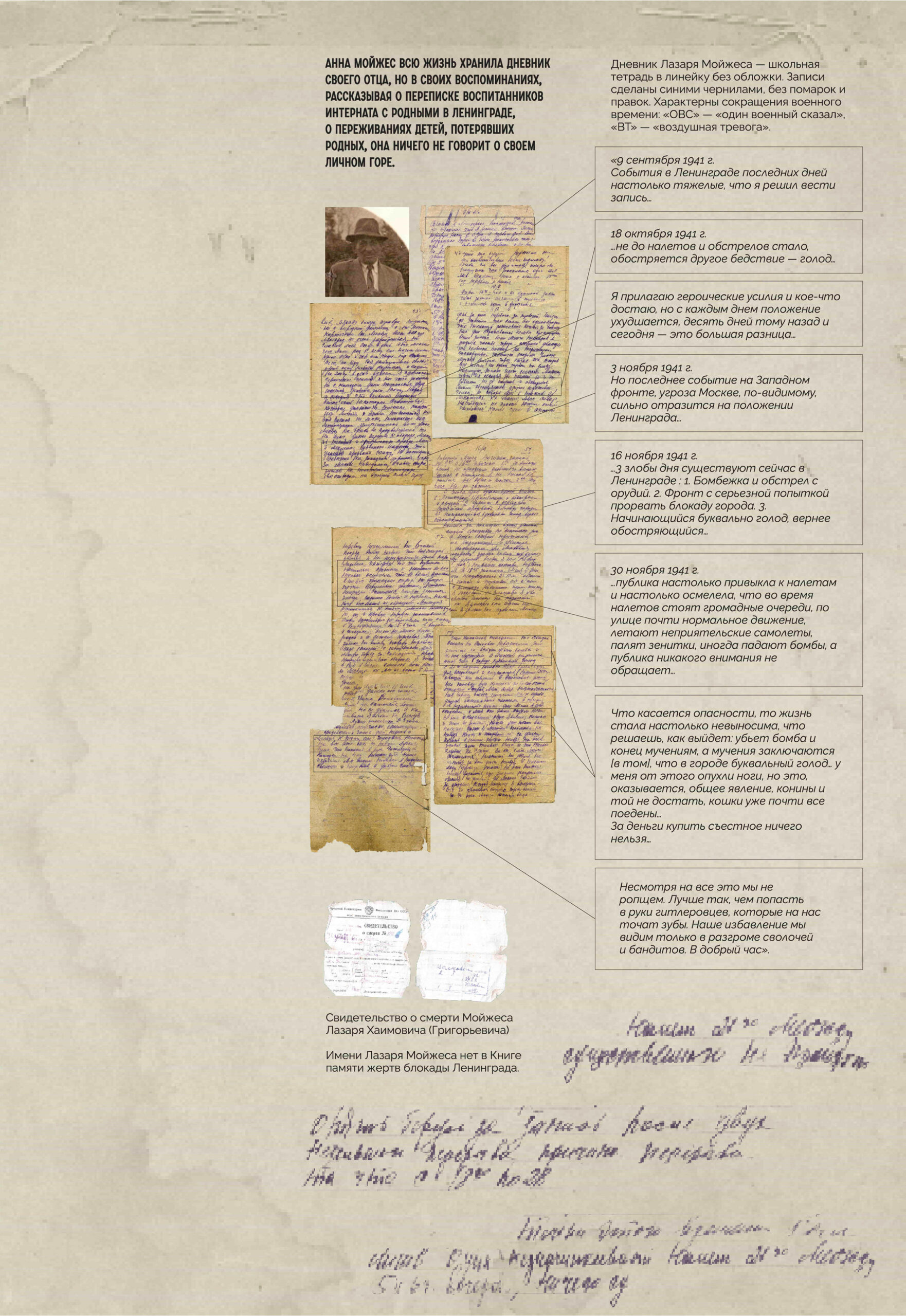 Анна Лазаревна Мойжес (1910-2004), известная ленинградская журналистка, в 1990-х годах записала воспоминания о жизни в эвакуации, где она находилась в числе сотрудников интерната детей ленинградских журналистов. Выставка подготовлена в рамках инициативы «Гуманитарный жест» совместно с партнёрами — АНО «Культура памяти» и ГБУК ЛО «Музейное агентство».